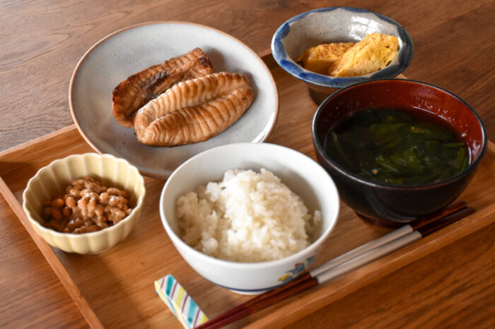 ・メニュー:白米、能登の海藻入り味噌汁 、フグ一夜干し1枚、納豆か卵焼き(お選びください)